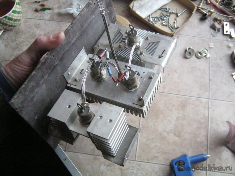 Определился с силовыми элементами – тиристоры Т142 – 63 – 7. Все четыре. Одинаковые, в корпусе на резьбовой шпильке. С учетом установки тиристоров, среди имеющегося подобрал хоть сколько то похожие радиаторы. Радиатора получилось три – два тиристора на одном и два на радиаторах своих собственных. Все радиаторы разные, их пришлось скреплять в единый модуль через изолятор – этакие боковые стенки из нетолстого листового текстолита. «Несущие», да.