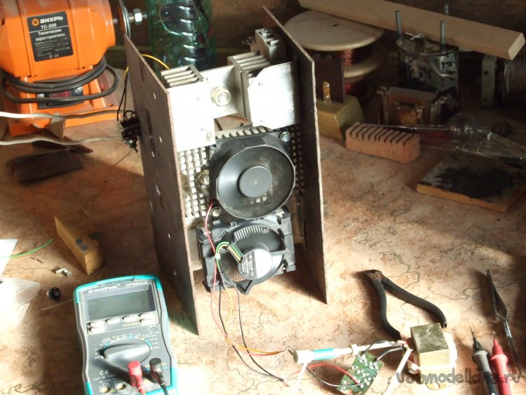 Выпрямитель снабжен парой низковольтных вентиляторов для принудительного обдува радиаторов (Фото 17). К компьютерному полагался штатный, на пластиковых защелках, к «пАрному» приспособил стандартный «кулер». Его привинтил обрезанными кровельными саморезами, между зубьев.