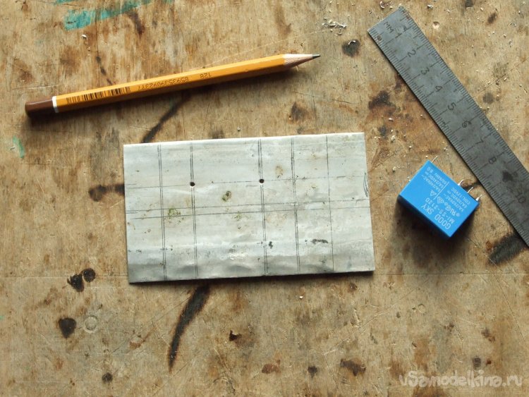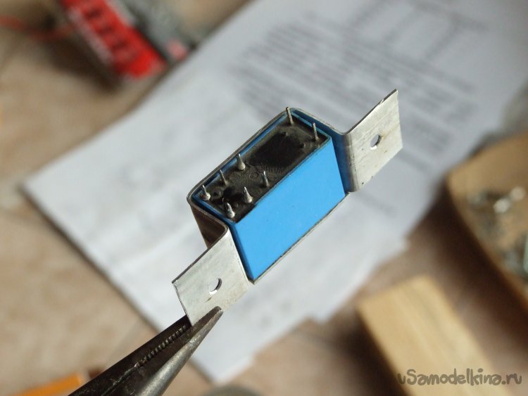 Небольшое промежуточное электромагнитное реле с двумя группами контактов, для управления выпрямителем, закрепил на боковой стенке блока самодельной скобочкой. Её выгнул из нетолстого алюминиевого листа – разметил и вырезал ножницами по металлу развертку, согнул, просверлил крепежные отверстия.
