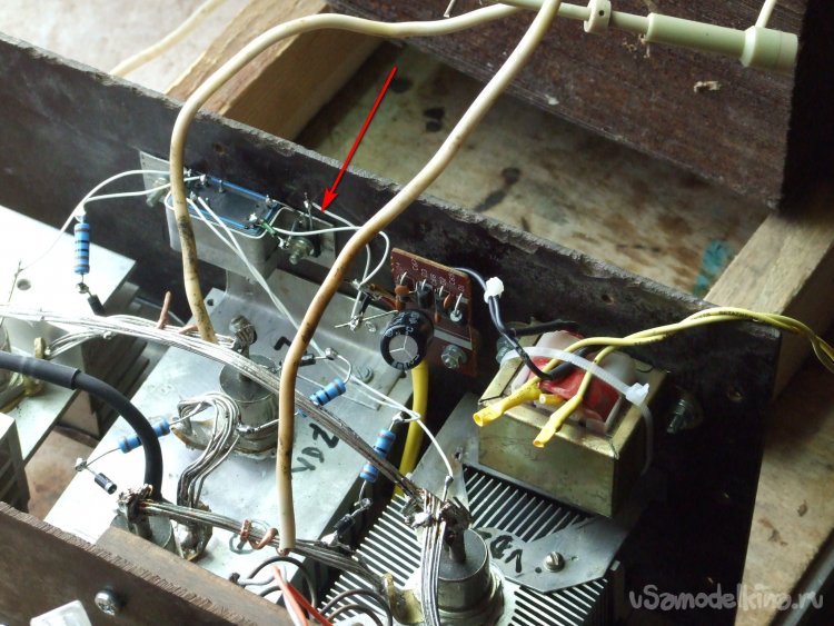Фото 21. Маломощная «сервисная» часть выпрямителя – трансформатор и платка выпрямителя для питания промежуточного реле и вентиляторов, само реле и транзисторный ключ на КТ815 (указан стрелочкой). Под спинку транзистора нанес чуток термопасты.