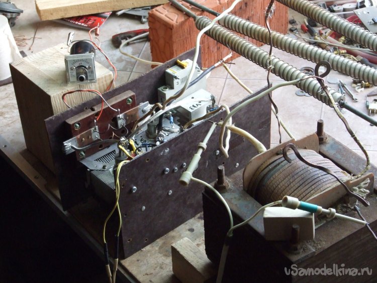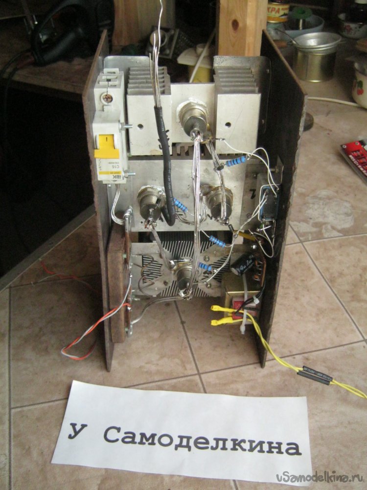 Фото 22. Выпрямитель в сборе. Прогон. В качестве нагрузки применил три последовательно соединенных нагревателя от промышленной печи.