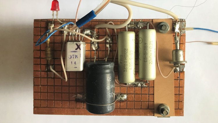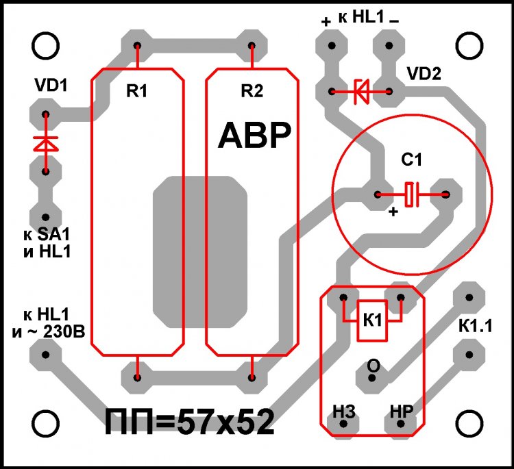 В авторском экземпляре АВР, детали расположены на фольгированной монтажной плате, медный слой которой разрезан на клеточки 5 х 5 мм. Имеется и замена деталей на макетке, указанных в схеме: 1). Диод VD1 – Д226Б (0,3 Ампера, 400 Вольт). 2). Красный LED схемы АЛ307Б заменён суперъярким зелёным. Кроме того, в схеме АВР можно использовать LED любых цветов и типов.