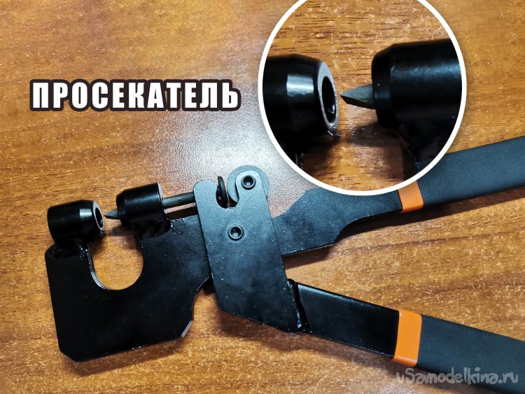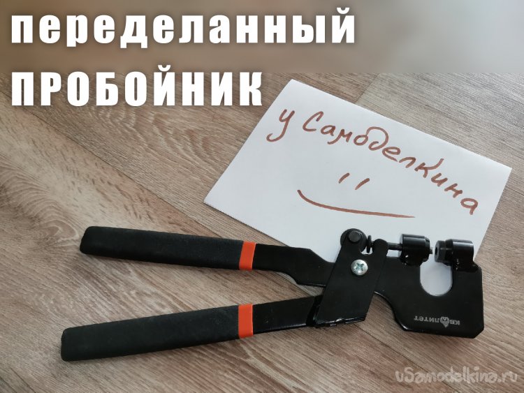 Взял подходящий кусочек листового металла, вставил его между "ухом" и штоком, сжал рукоятки пробойника- в металле образовалось ровное отверстие.