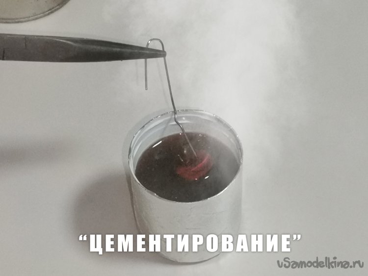 - Раскаленную деталь опускаем в баночку с порошком из чистого графита, при этом происходит насыщение углеродом поверхностного слоя металла (собственно это и есть процесс "цементирования"),