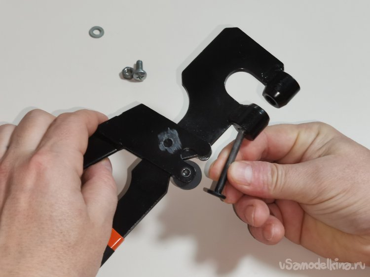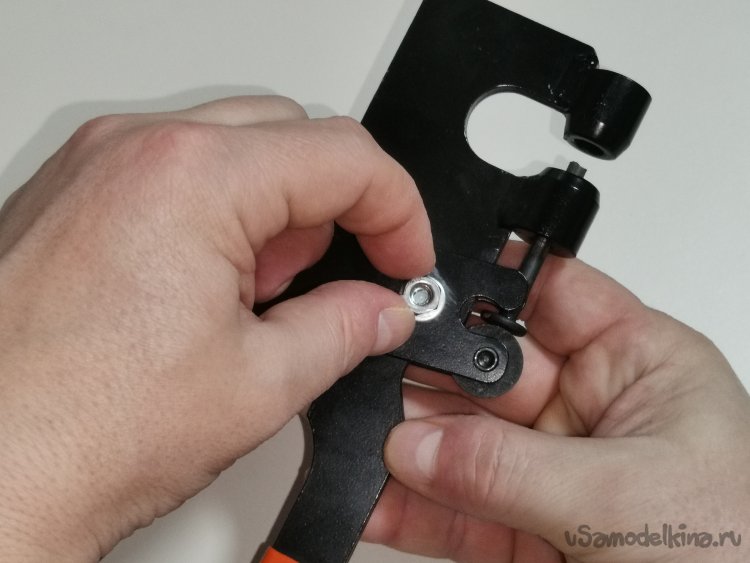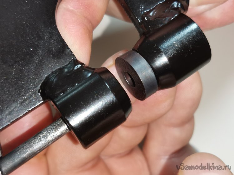 Запрессовав втулку в отверстие "уха", вставил шток в свое штатное место, и вместо стоявшей ранее клепки- соединил болтом с гайкой обе рукоятки перекрестно.