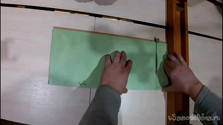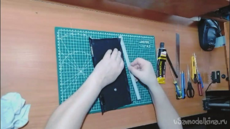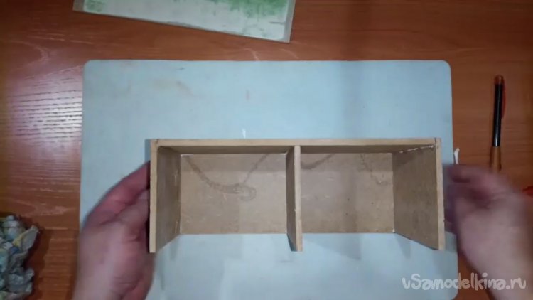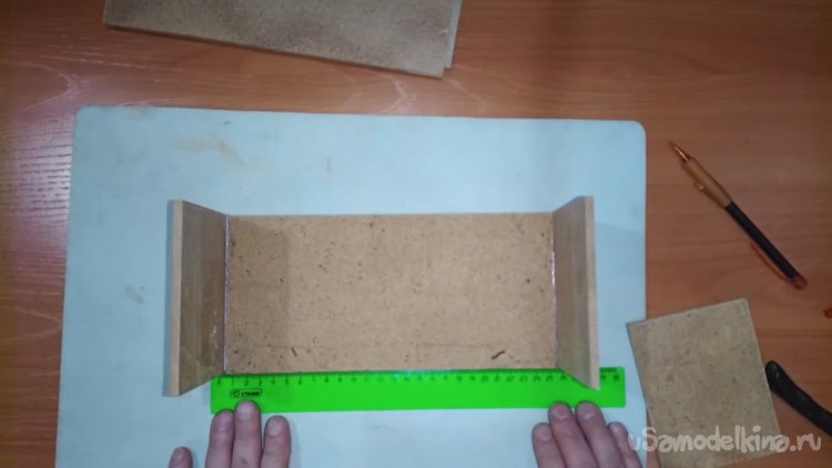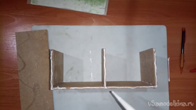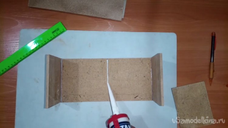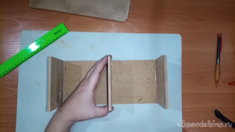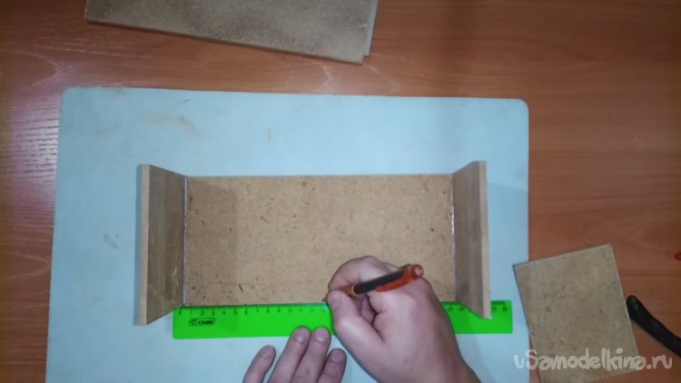 Затем разметим середину нижней секции с помощью линейки, для вклеивания перегородки отсека.