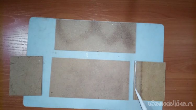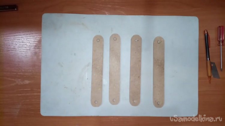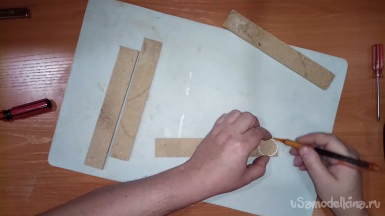 Отпилил четыре одинаковые полосы из панели ХДМ. Разметил скругления.
