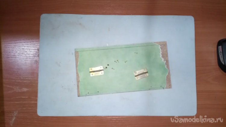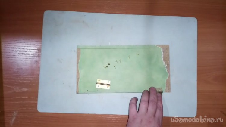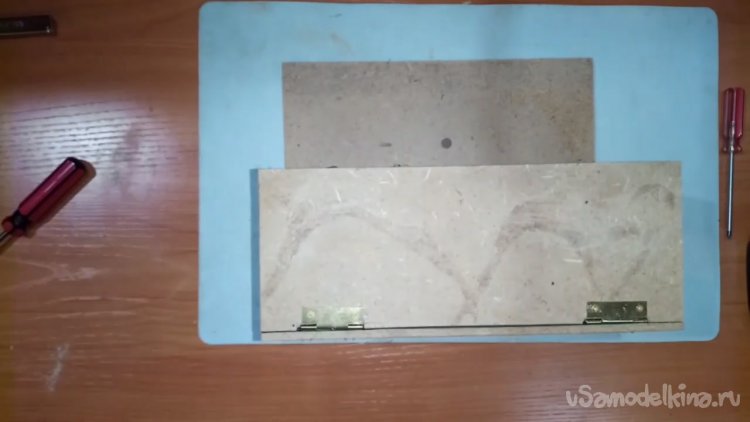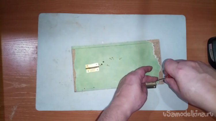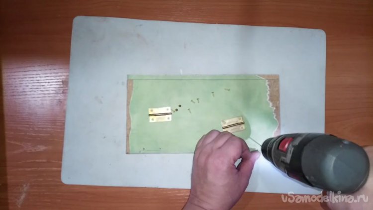 Прикрутим петли к детали - крышка ящика, с помощью мелких саморезов. Размечаем карандашом, где будут отверстия под саморезы.