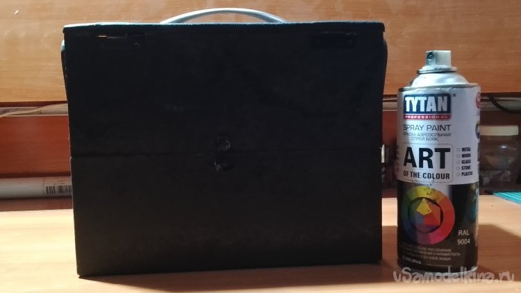После проверки разберём ящик на составляющие детали. Возьмём баллончик чёрной аэрозольной краски и покрасим все детали с наружной стороны.
