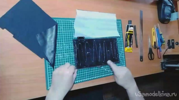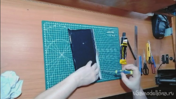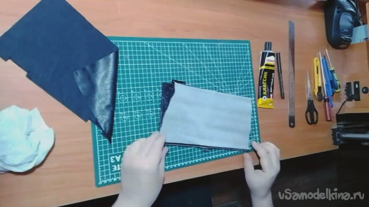 Далее возьмём подготовленный кусок экокожи и промазав по краям клеем Момент Классик приклеиваем к основанию.