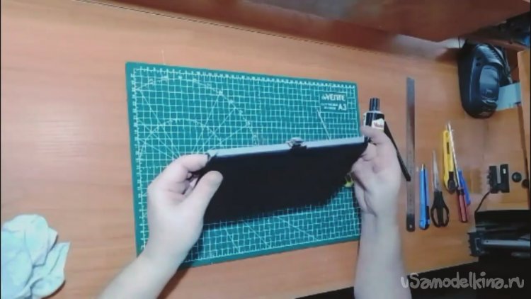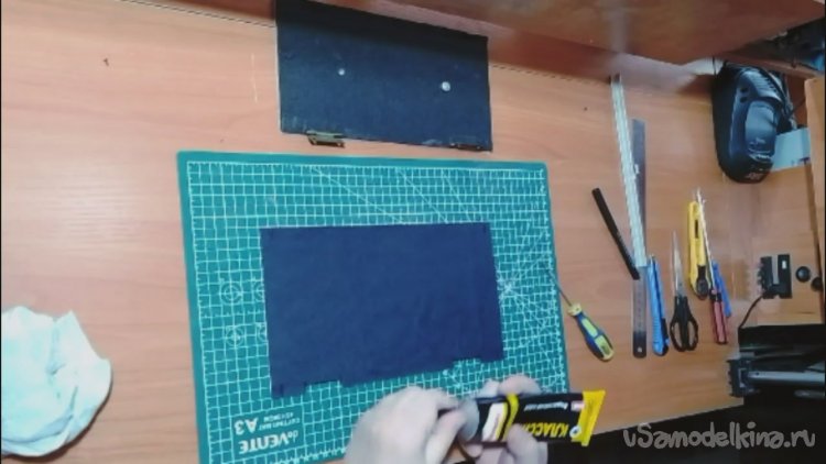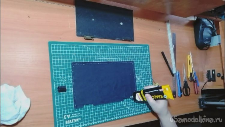 После покраски деталей, посмотрел на верхнюю крышку и понял, что такой вид не пойдёт и решил облагородить её экокожей чёрного цвета, благо такая как раз оказалась под рукой. Отрежем кусок экокожи и кусок подложки под половой ламинат. Намажем клеем Момент Классик поверхность крышки.