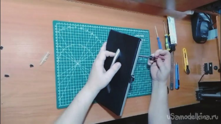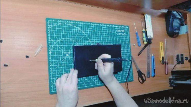 Это важно! Прожигаем паяльником в экокоже отверстия под крепление ручки. Таким образом края материала приплавляются и не расползутся со временем.