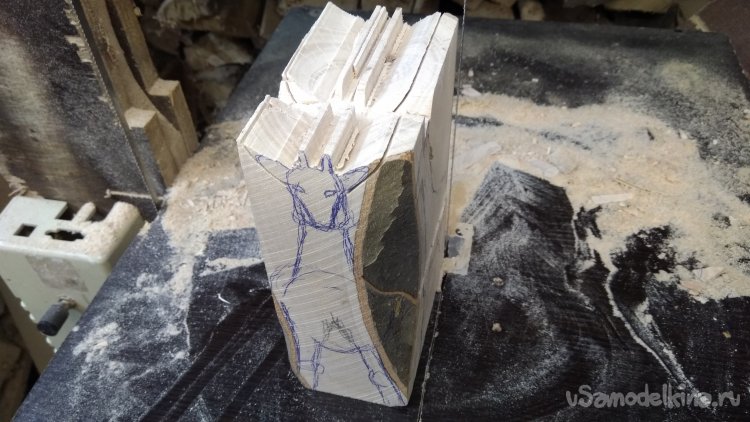 Множество пропилов, но по чуточке оставляю недопиленное, чтобы не развалилась заготовка.