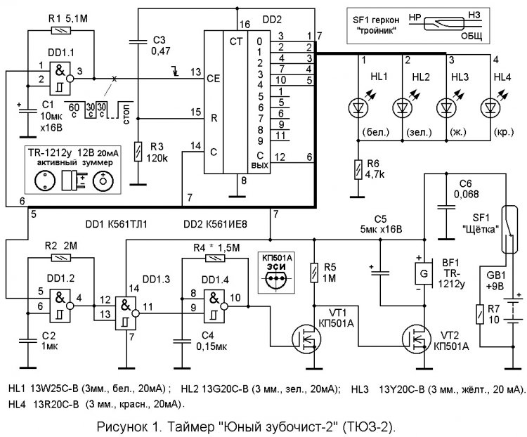 При вынимании ЗЩ из стойки, магнит закреплённый на ручке щётки удаляется от геркона SF1 (см. рисунок 1) и SF1 устанавливается в правое (по схеме) положение. Напряжение питания с батареи GB1 поступает на цепь C3, R3 установки ТЮЗ-2 в исходное (нулевое состояние). Пока конденсатор С3 заряжается через резистор R3, на нижней (по схеме) обкладке С3 присутствует высокий уровень напряжения, который поступает на вход R («Сброс») – вывод 15 DD2 и устанавливает счётчик DD2 в исходное состояние: На выходе «0» (выводе 3) DD2 устанавливается логическая единица и белый светодиод HL1 включается, указывая, что началась 1-я минута работы таймера, а на всех остальных выходах DD2 устанавливаются логические нули и остальные СДИ не светятся. Одновременно на вход (вывод 1) элемента DD1.1, с выхода переполнения «С вых» (вывод 12) DD2 подаётся логическая единица, разрешающая работу тактового генератора, собранного на элементах DD1.1, C1, R1. Генератор импульсов начинает работу и на его выходе (выводе 3 DD1.1) периодически появляются импульсы прямоугольной формы с периодом следования 60 ± 1 с и скважностью 2 (меандр). Период следования импульсов определён номиналами времязадающей цепи C1, R1. Причём, первый отрицательный (счётный для входа СЕ DD2) перепад напряжения на выходе (выводе 3) DD1.1 появляется также через минуту после включения питания ТЮЗ-2 (несмотря на то, что он первый). При первом, втором и третьем счётном перепаде напряжения на входе СE (выводе 13) DD2 уровень логической 1 поочерёдно появляется на выходах «1», «2», «3», вызывая (также поочерёдное и поминутное) свечение светодиодов: HL2 (зелёного), HL3 (жёлтого) и HL4 (красного).