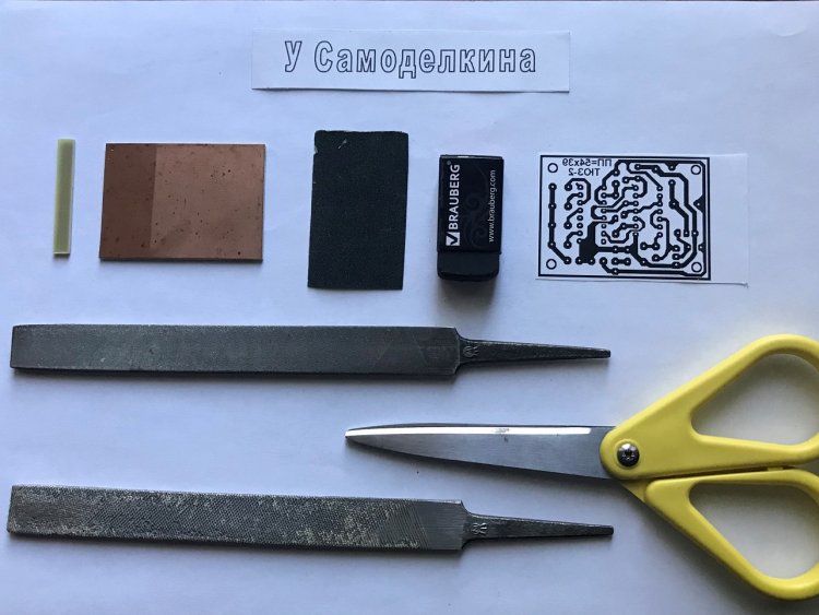 Кромки вырезанной ПП обрабатываются на личном и бархатном напильниках. Отражённый рисунок ПП вырезается ножницами, оставляя припуск с одной из сторон (на рисунке 7 припуск сделан справа).