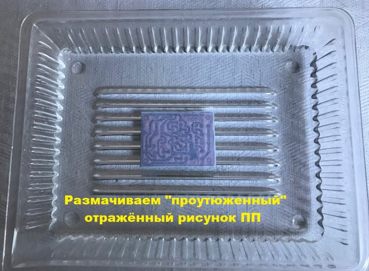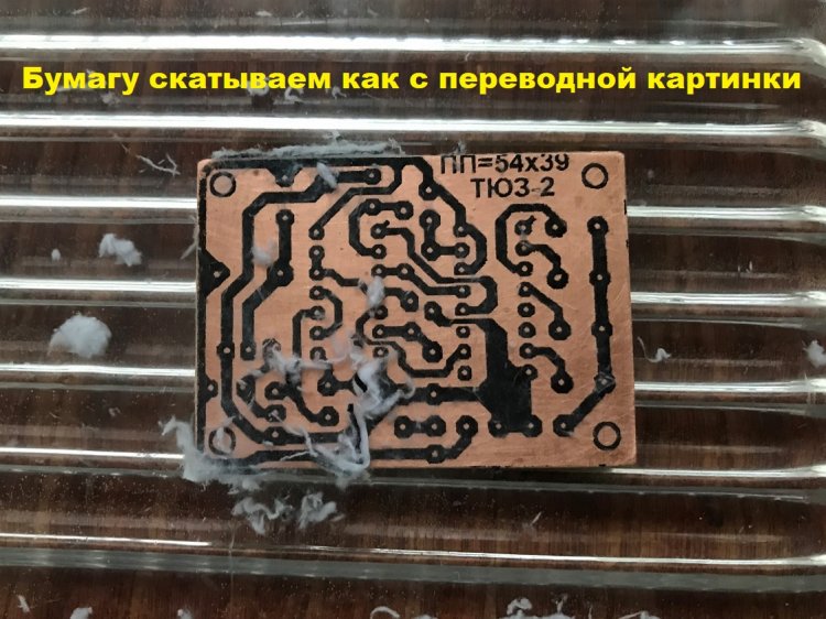Если отражённый рисунок ПП сам не «отделился» от фольгированной поверхности платы, значит была неправильно выбрана температура утюга. Однако и в этом случае есть выход. Рисунок можно размочить и через 1-2 минуты скатать бумагу пальцем как с переводной картинки. Однако если бумажные волокна вплавились в тонер, то прижим утюга был черезмерным и последние бумажные волокна следует стирать очень осторожно и медленно (до десятка минут), постоянно смачивая палец водой, чтобы не стереть тонер (краску принтера).