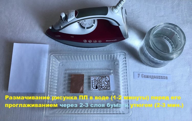 В фото кюветке (или другой химически нейтральной посуде) размачивается отражённый рисунок ПП, который тонером накладывается на медную фольгу платы и (через несколько слоёв бумаги) проглаживается утюгом до «проступления» рисунка ПП на проглаженной стороне.