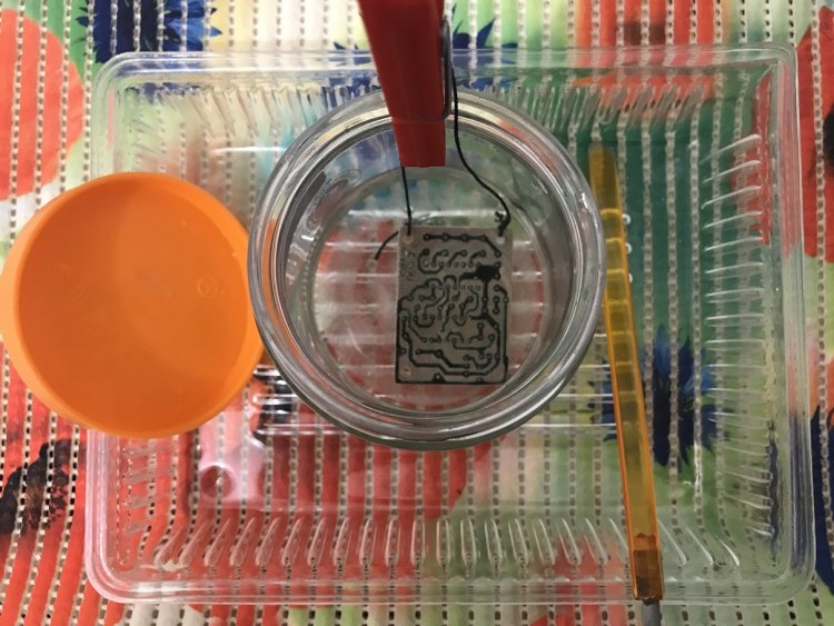Травление ПП. Для того, чтобы нитяная петля не падала в травящий раствор, к горлышку банки цепляется бельевая прищепка.