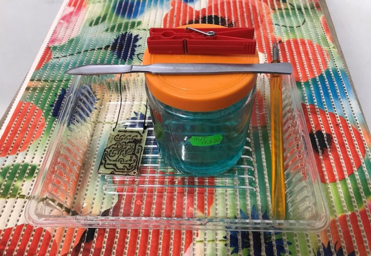 Перед травлением, в ПП делаются 2-4 отверстия, к которым привязывается петля из суровой нити. За петлю удобно вынимать ПП из травящего раствора и контролировать степень её протравленности. А также подёргивать, изменять местоположение и (при необходимости) изменять угол наклона платы.