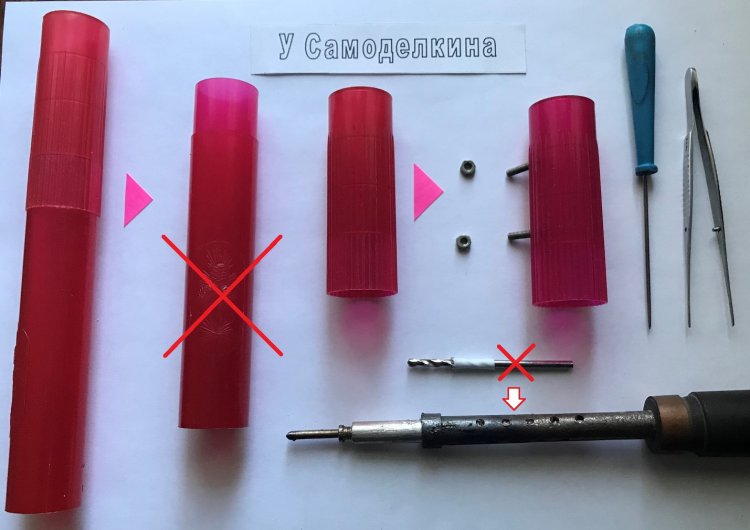 Стакан – держатель для зубной щётки можно изготовить из одной половинки школьного пенала. Авторский стакан изготовлен из хрупкой пластмассы. Его кернение и сверление в нём отверстий приводило к растрескиванию пластмассы. Оказалось, гораздо проще для проделывания отверстий использовать не дрель, а жало нагретого паяльника.