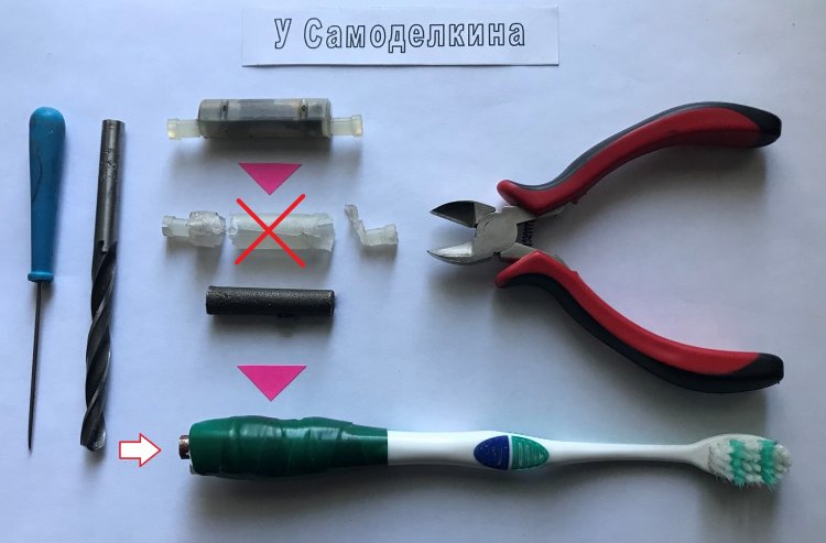 Постоянный магнит использован достаточно мощный, цилиндрической формы диаметром 7,5 мм. Зубная щётка перед сверлением обматывается несколькими слоями изоленты и закрепляется в губки тисков в вертикальном положении. Сверлить рекомендуется ручной дрелью.