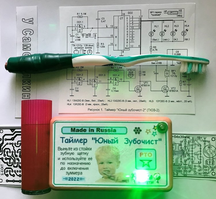 Зубной щёткой (далее просто ЗЩ) человек пользуется издревле. Родиной ЗЩ считается Китай, где её, как гигиеническое средство содержания ротовой полости в чистоте, используют более 10 веков. Однако попытки упорядочить (техническими средствами) использование ЗЩ начались совсем недавно. Как выясняется из опросов, многие люди чистят зубы не регулярно, и редко кто выдерживает минимально необходимое время. Обычно это объясняется леностью характера, отсутствием в ванной комнате часов, а без них при монотонном скучном занятии (чистке зубов) время течёт субъективно медленно. Постоянно использовать механические и электромеханические часы в условиях повышенной влажности в умывальнике не желательно. Специально приносить и каждый раз уносить часы, да ещё устанавливать их в режим таймера, очень неудобно, требует дополнительного времени, которого и так постоянно не хватает. Предлагаемый Вашему вниманию таймер «Юный зубочист» - 2 (далее просто ТЮЗ-2) легко решит данную проблему и не потребует от человека никаких дополнительных действий (включения питания, установки выдержки, нажатия кнопки запуска таймера, выключения питания) и временных затрат.