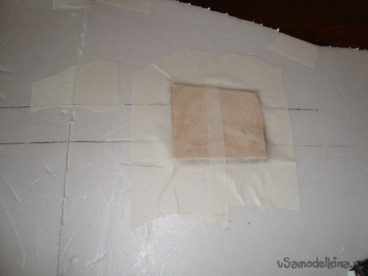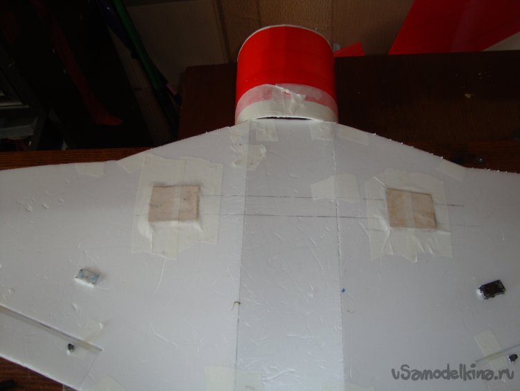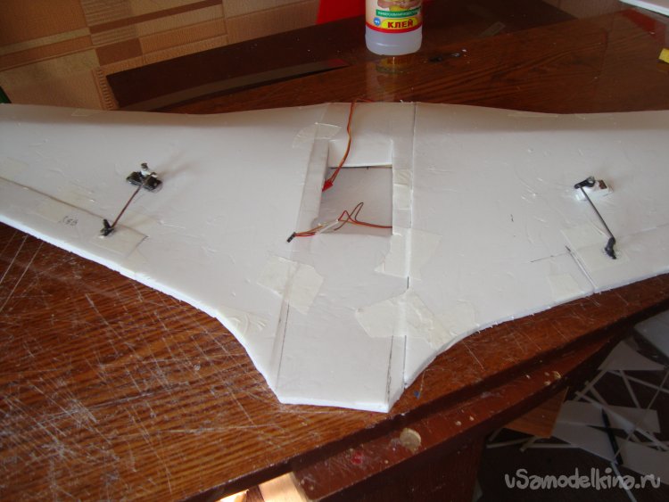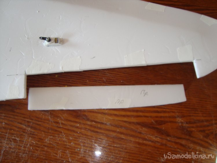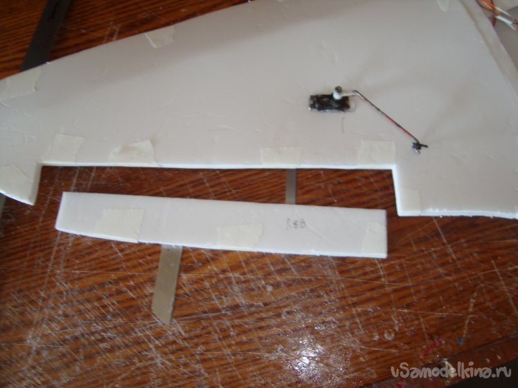 Вырезал в крыльях элероны, смонтировал сервомашинки. Элероны навешивал на бумажный, малярный скотч.