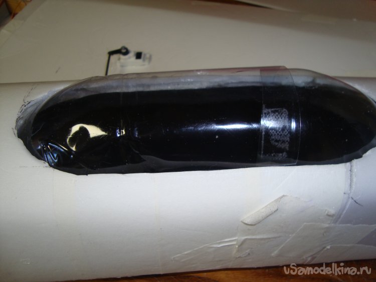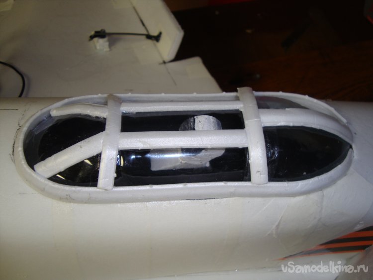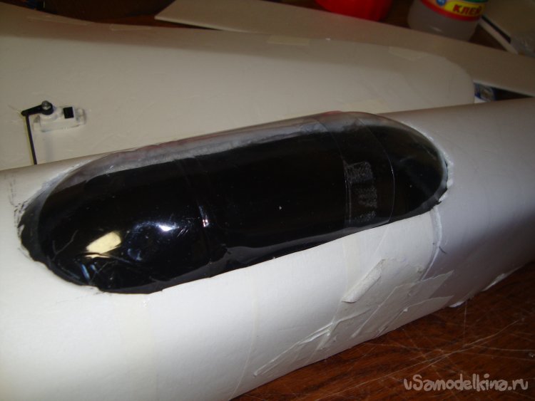 На месте установки кабины сделал вырезы в наружной обшивке , обтянул чёрным скотчем, выкроил остекление из пластиковой бутылки, сделал фигурку пилота.