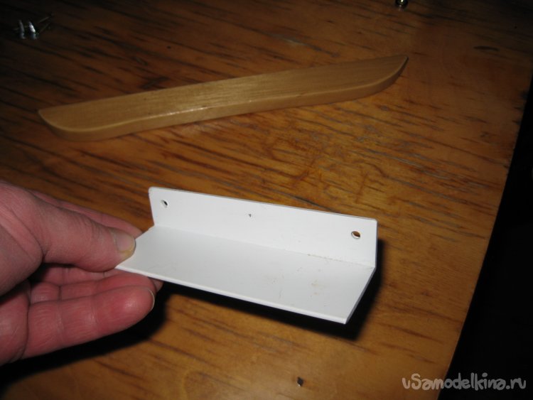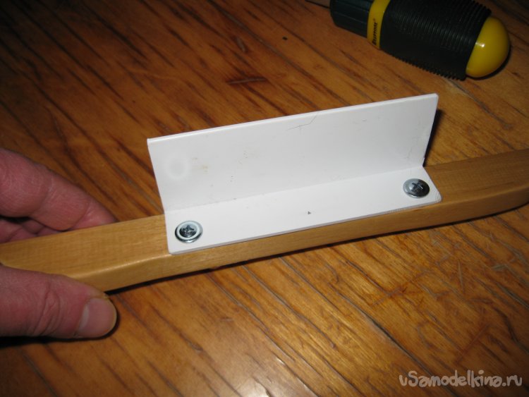 Шаг 2. При помощи двух шурупов с прессшайбой, я прикрутил к другой стороне дощечки пластиковый уголок.
