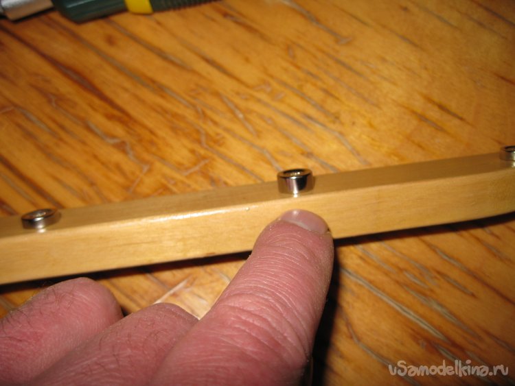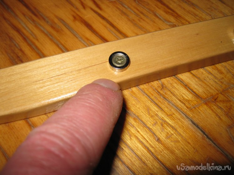 Шаг 1. Сначала я разметил дощечку при помощи рулетки и карандаша на четыре части и при помощи отвертки прикрутил к ней мелкими шурупчиками, четыре неодимовых магнита.