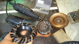Лишнее отпилил, теперь буду стругать. Черновая обработка диском установленным на болгарку