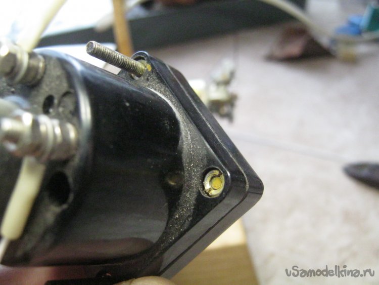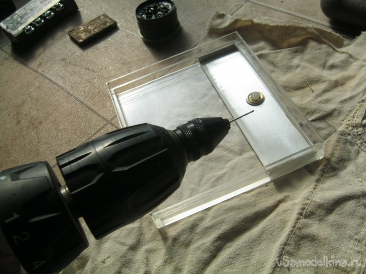 Металлический штырек запрессованный в карболитовую крутилку вырвал плоскогубцами. Пластиковый выступ на большом приборе срезал кусачками, на его месте шилом наметил центр отверстия. Подобрал миниатюрное сверло несколько меньшего, чем новый штырек, диаметра и просверлил отверстие. Запрессовал новый металлический палец и настроил его - укоротил по месту так, чтобы при закрытии прозрачной крышки прибора, подвижной системе ничто не мешало.
