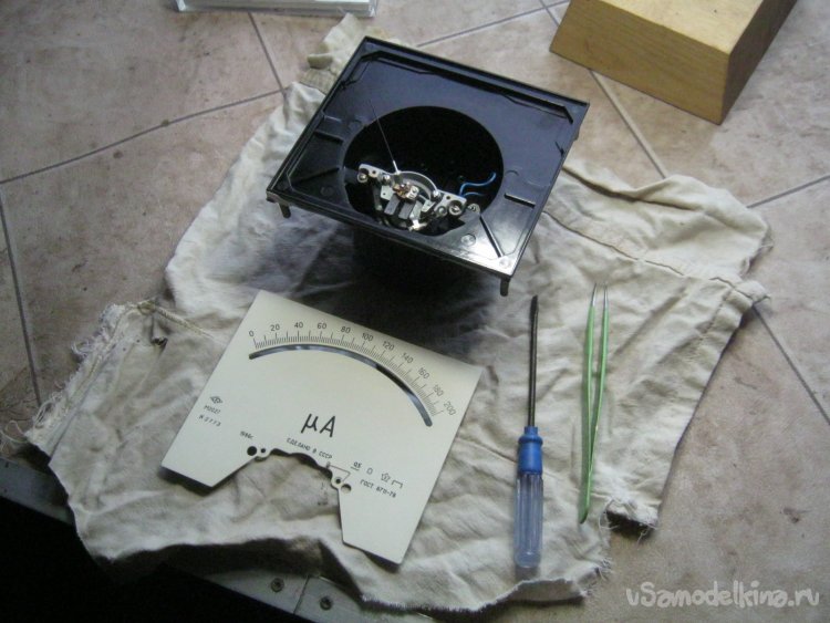 Мелкий микроамперметр вскрывается без особенного труда – отвинчиваются специальные гаечки по углам рамки с обратной стороны (Фото 3). Гайки на коротких винтах легко отвинчиваются плоской отверткой с широким и узким лезвием, на длинных – шилом или толстой иглой (двумя).