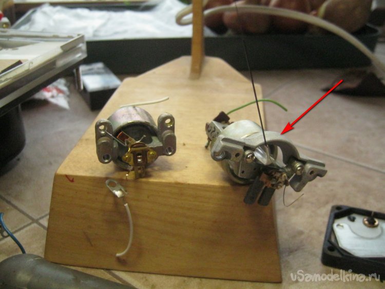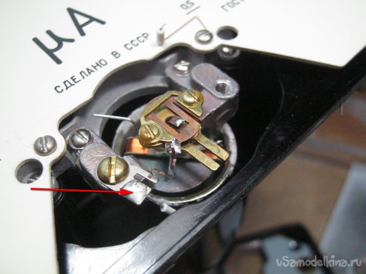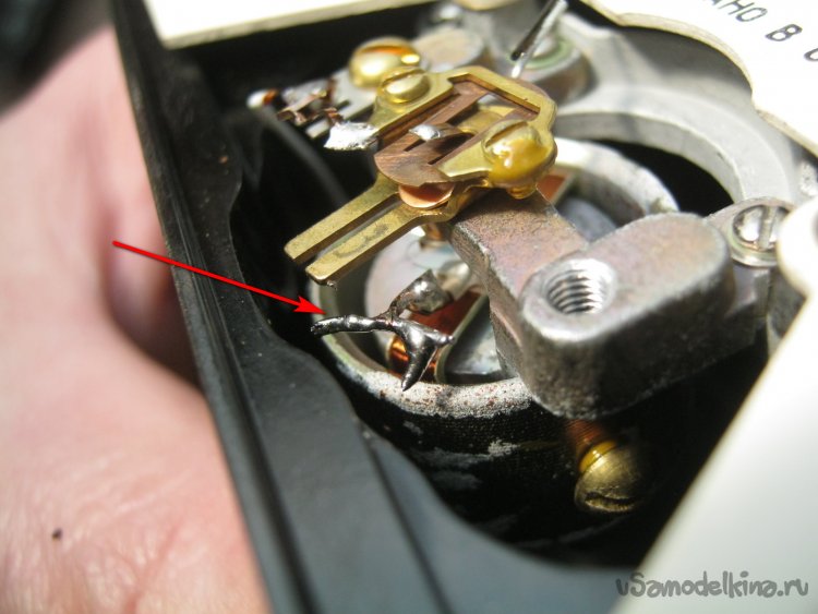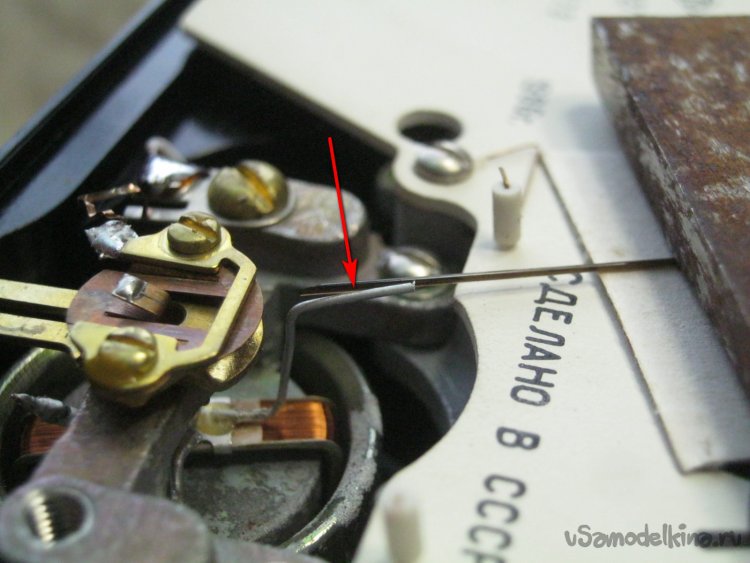 Целое дело оказалось со стрелкой. Она длинная и должна быть вполне легкой, чтобы меньше нагружать подвес рамки с катушкой. Традиционно делается из тончайшей алюминиевой трубочки. Здесь же, в металлическом лепестке зажат кусочек тонкого стержня (Фото 14).