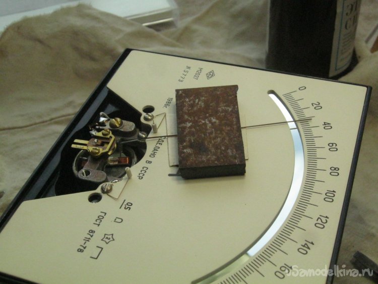 Именно такого рода прибор и потребовался – для примерной диагностики нормального состояния, но метров с трех-четырех. То есть прибор нужен с крупной шкалой. В наличии же имелись только несколько сортов малявок, разглядывать которые пришлось бы в бинокль. Отыскался и почти новый, великолепный зеркальный крупношкалик с подходящим вертикальным рабочим положением. Всем хорош, но с горелой катушкой. Походив несколько дней вокруг, таки решился на операцию по пересадке электромагнитной системы приборов – сердца измерителя.