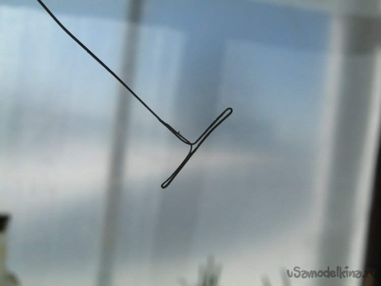 От самой тонкой части заготовки - стеклянной нити отколол кусочек нужной длины и установил в прибор – двумя пинцетами, чтобы не оторвать нежные подвесы рамки, подогнул огрызочек алюминиевой стрелки и приложил к нему стеклянную струну (Фото 16, 17). Чтобы стеклянная часть имела свободный ход, приподнял ее на кусочке плотного ровного картона и зафиксировал детали грузиком – некрупной железкой.