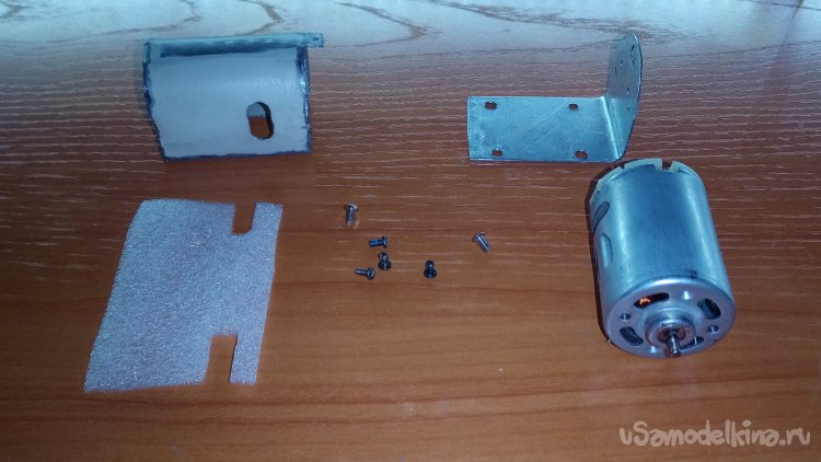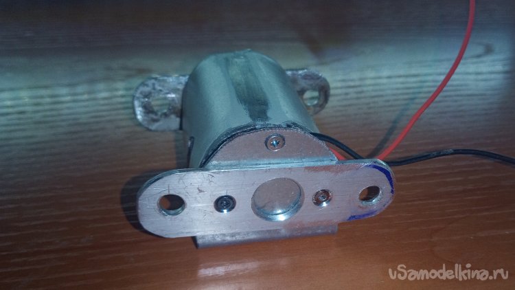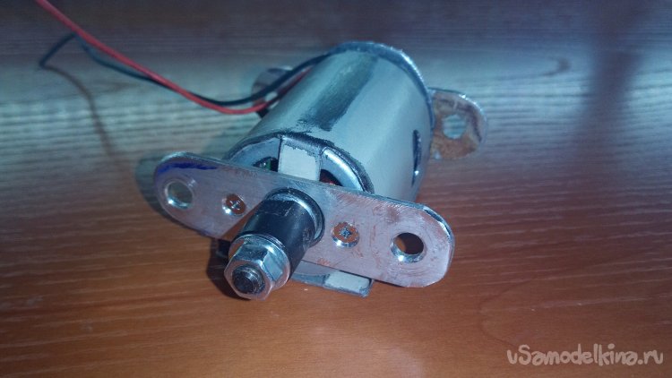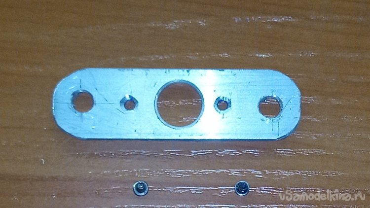 Устанавливаем с помощью винтов алюминиевую направляющую пластину с передней стороны мотора, при этом зажимаем в руке металлическую деталь, что бы она не разгибалась.