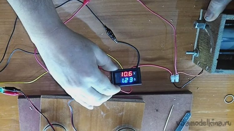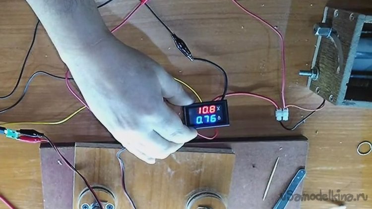 Тут проверяю как мотор работает от сети 12в и какой ампераж выдаёт.