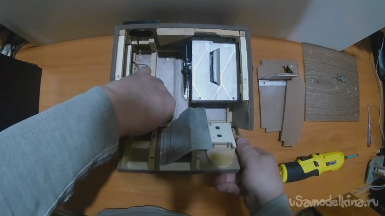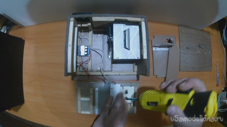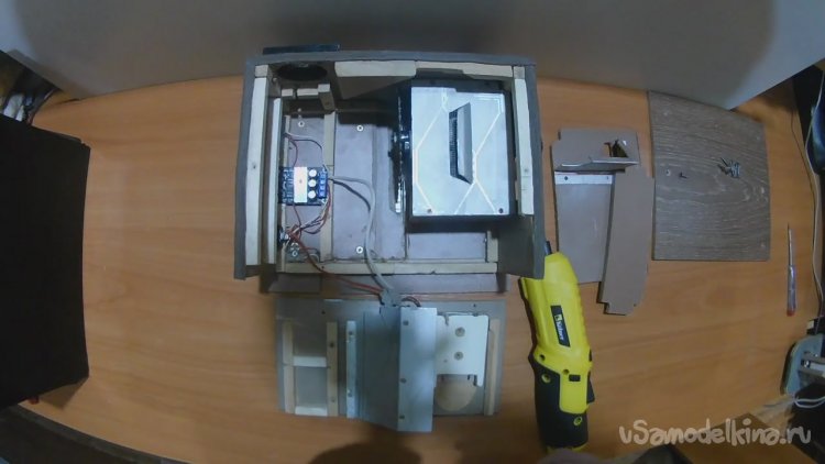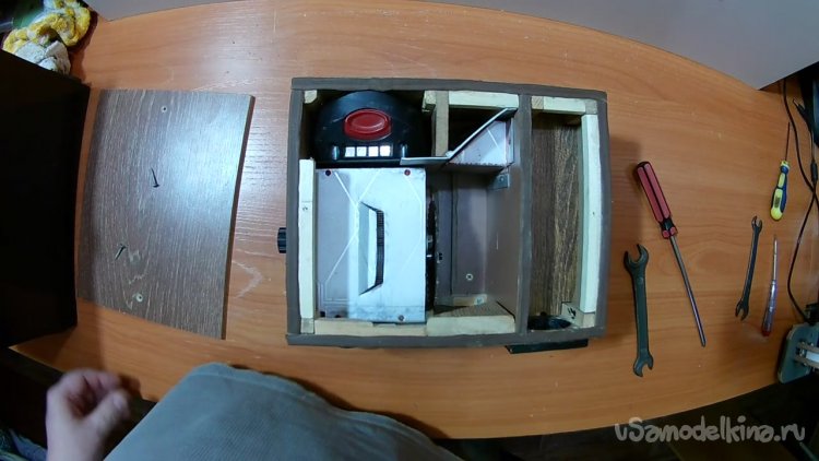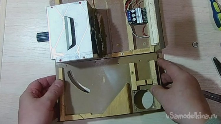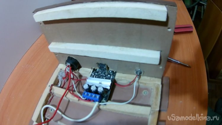Соединил все электронные компоненты, сделал под них отверстия в боковой стенке и установил эту часть электроники на место. Вид изнутри.