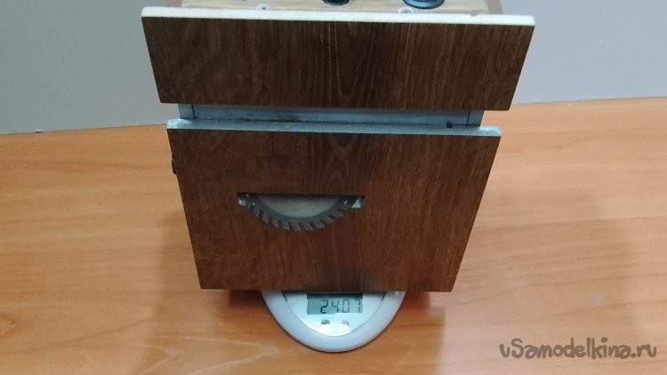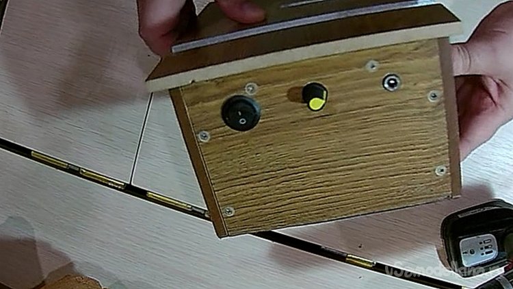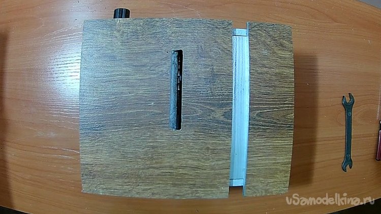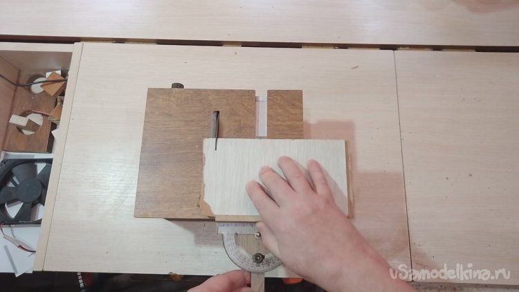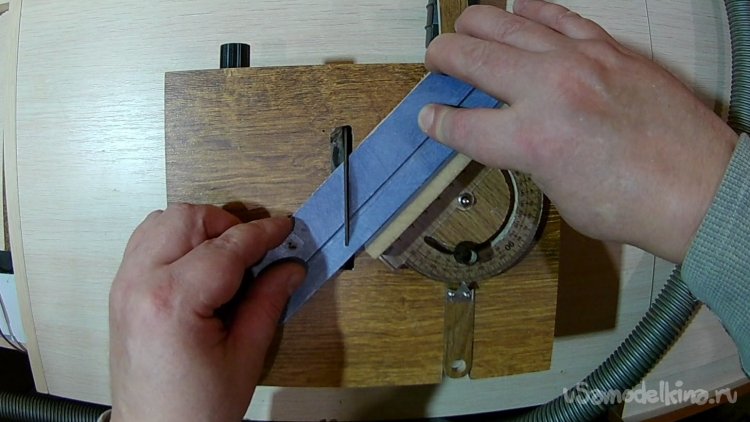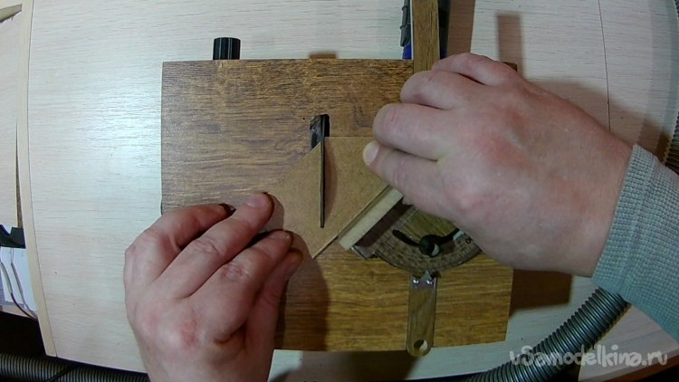 В большой стенке вырезал дуговую прорезь под регулятор-барашек для наклона пилы на 45 градусов. Внутрь корпуса вклеил треугольник из дерева, который ограничивает наклон до 45 градусов.
