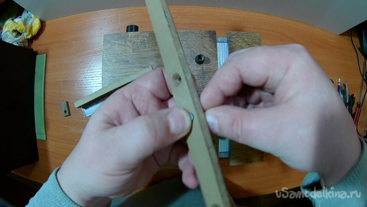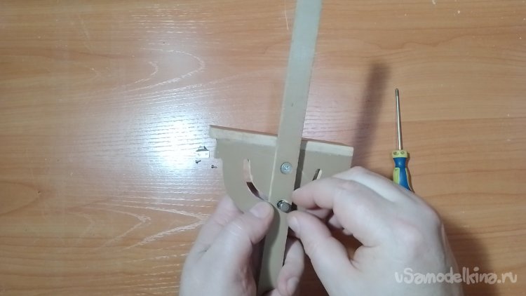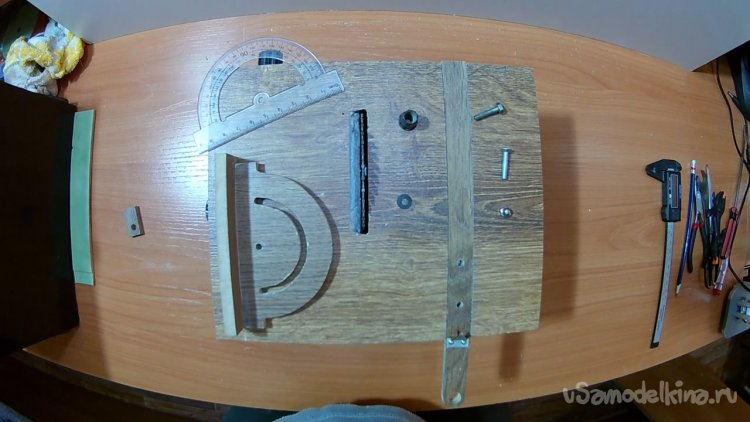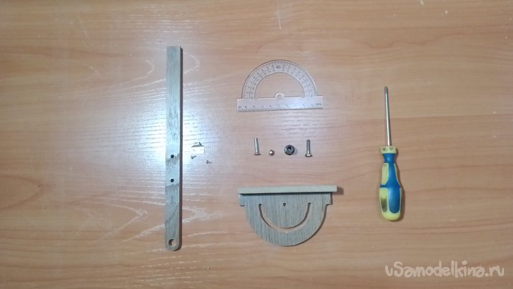 Вот список деталей для сборки толкателя: отрезок из ламината, пара болтов м4, накидная гайка м4, барашек м4, транспортир, кусочек жести, пара мелких саморезов на 5мм.