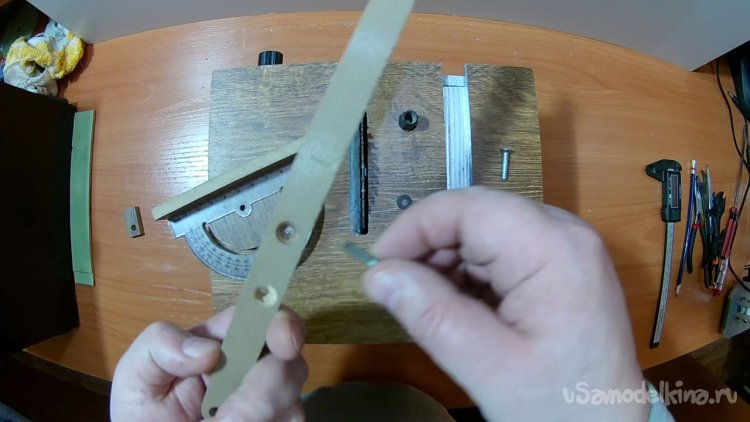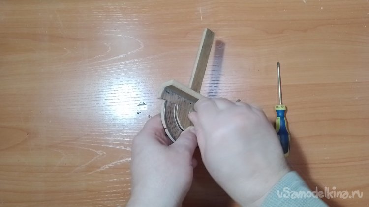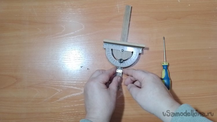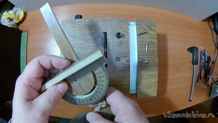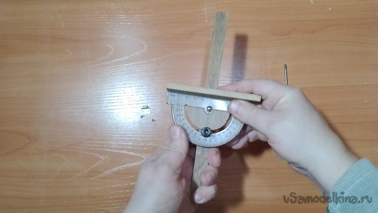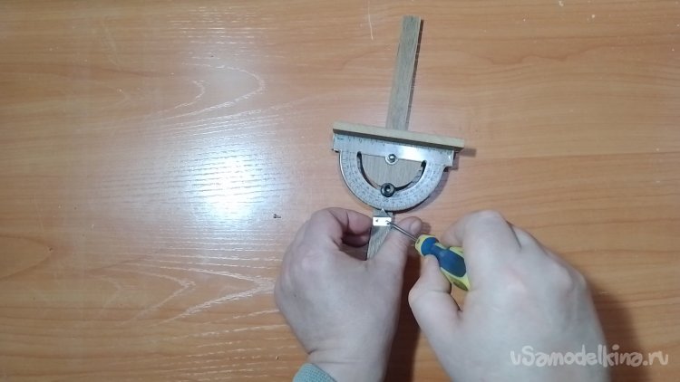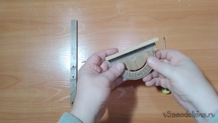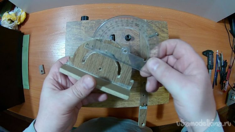 Вырезал паз дуговой для того, что бы транспортир мог ходить по полукругу.