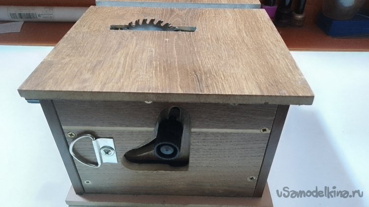 Сам корпус, как впрочем и внутренний подвижный узел, делал из полового ламината 7 мм. Корпус станка состоит из семи частей. Верхняя рабочая часть (крышка) состоит из трёх деталей. Нижняя деталь, соединяющая две верхние уже по размеру, и по ширине входит точно под размер корпуса. Она крепится к двум частям основного пильного стола при помощи саморезов 10 мм и клея. Получилось углубление для функционального толкателя, которое покрасил в металлический цвет для эстетики, в будущем думаю ещё сделать каретку для этого станка.
