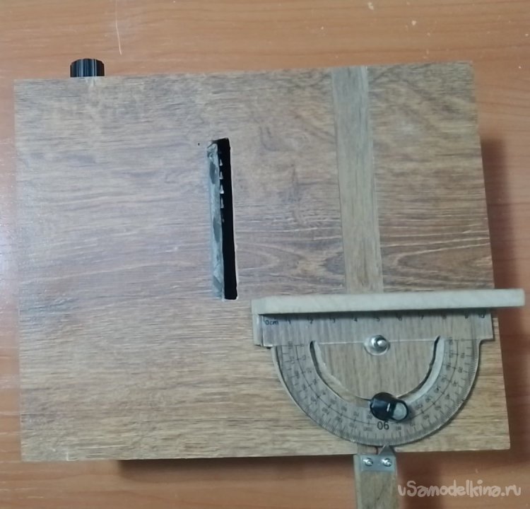 Сам транспортир не вклеивал, он входит в заранее пропиленный паз в боковой перегородке полотном по металлу, пропил получился точь-в-точь по толщине транспортира.