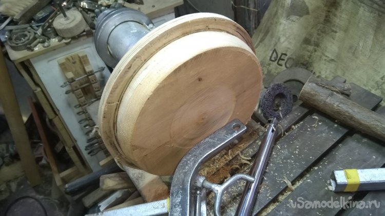 Новую планшайбу прикрутил к старой металлической, зажал в токарный станок, проточил и приклеил тарелку к планшайбе через бумажный лист.