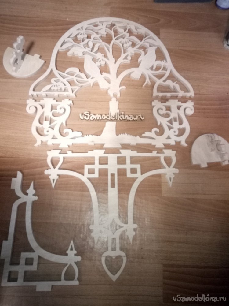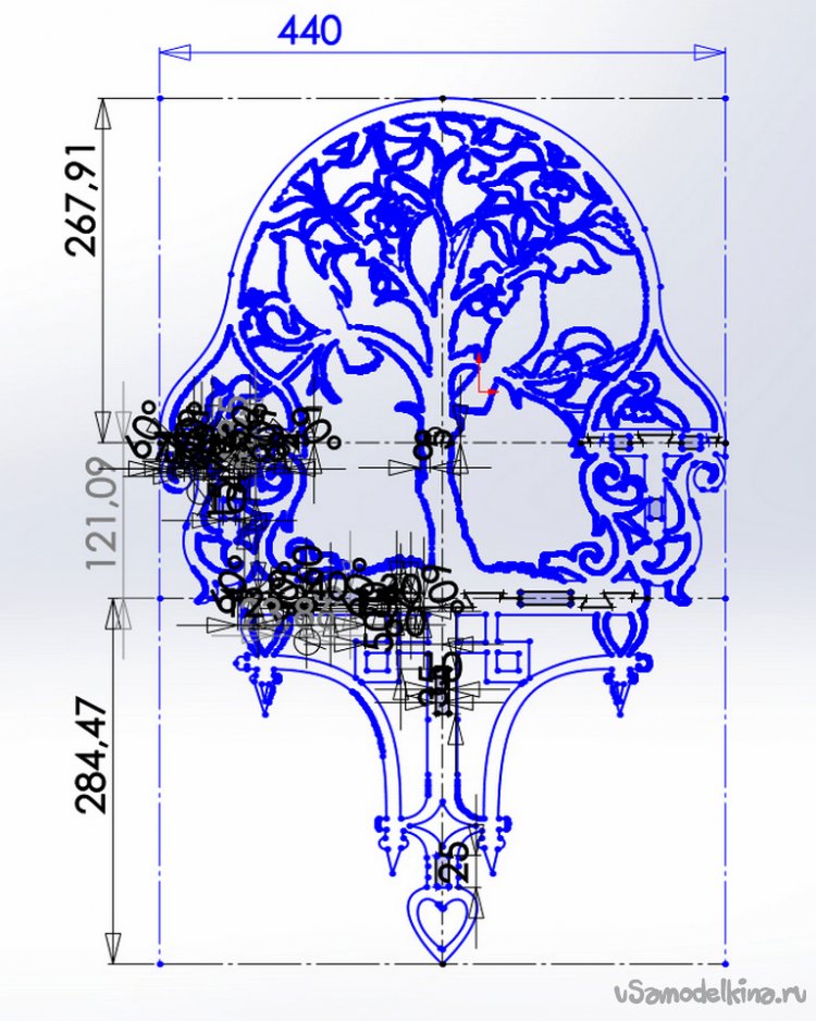 Для начала работы над проектом необходимо определиться с материалом и габаритами будущего изделия. Использоваться будут обрезки (приличного размера) хвойной фанеры 10 мм. С габаритами посложнее. Так как рабочая зона моего фрезерного станка составляет всего лишь 300мм х 500мм, то это первое значение, на которое буду опираться. Если представить размер задней резной стенки уложенной в этот размер, то станет понятно, что мелковатая получится полочка. Поэтому придется разбить большую деталь на несколько составных частей, помня о рабочем размере (500х300).