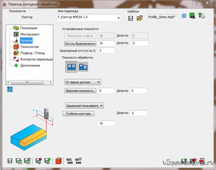 Для выполнения этой операции кроме задания траекторий следует выбрать режущий инструмент (у меня уже заложены номинальные параметры для каждой фрезы), задать уровни, выбрать нужную технологию обработки.