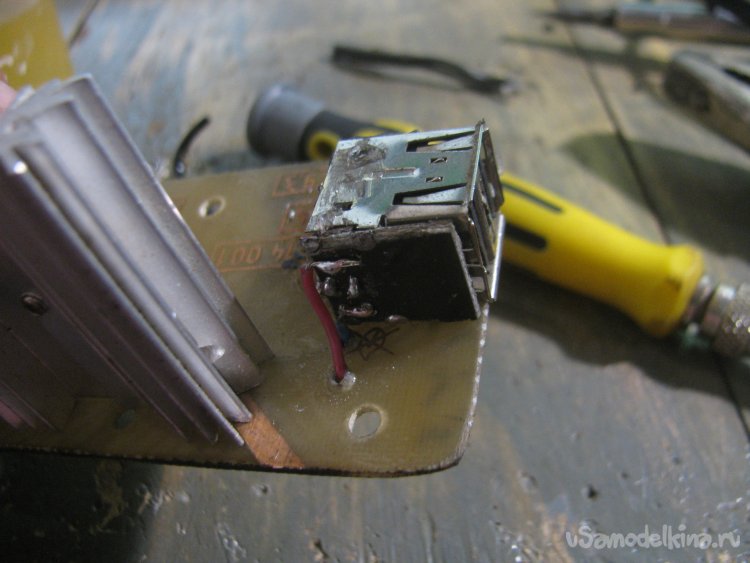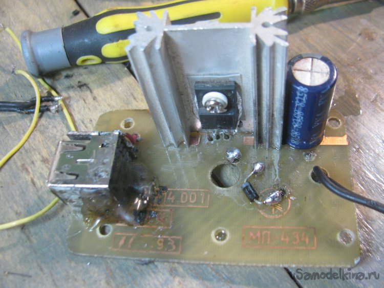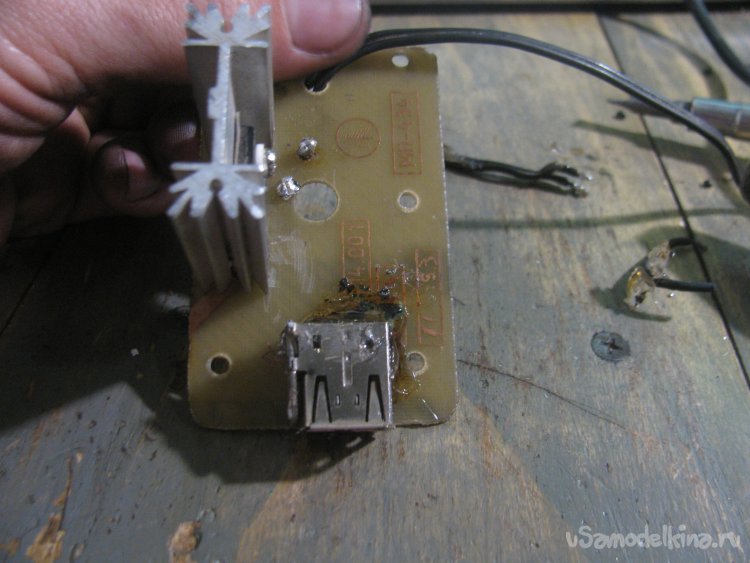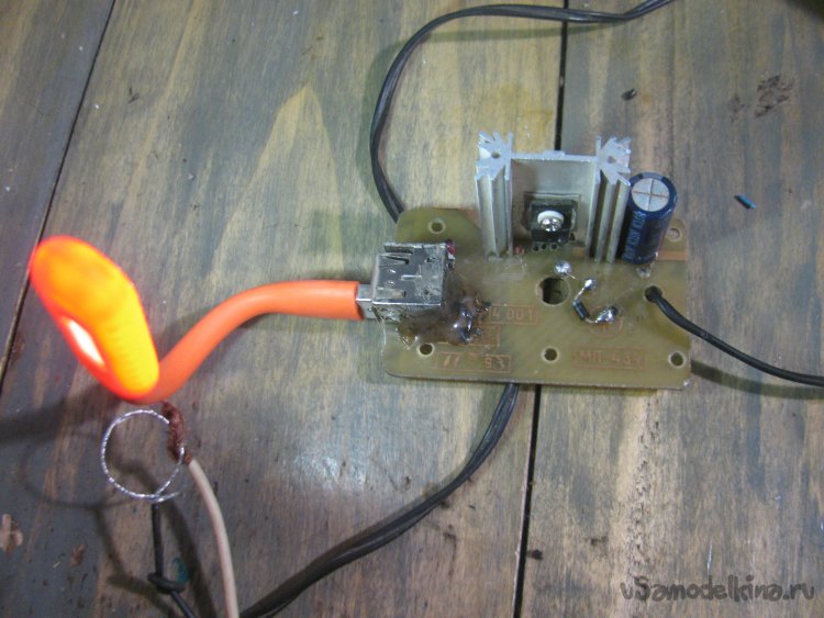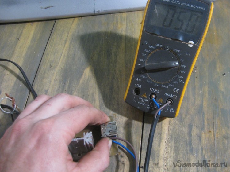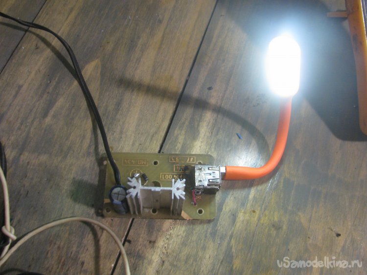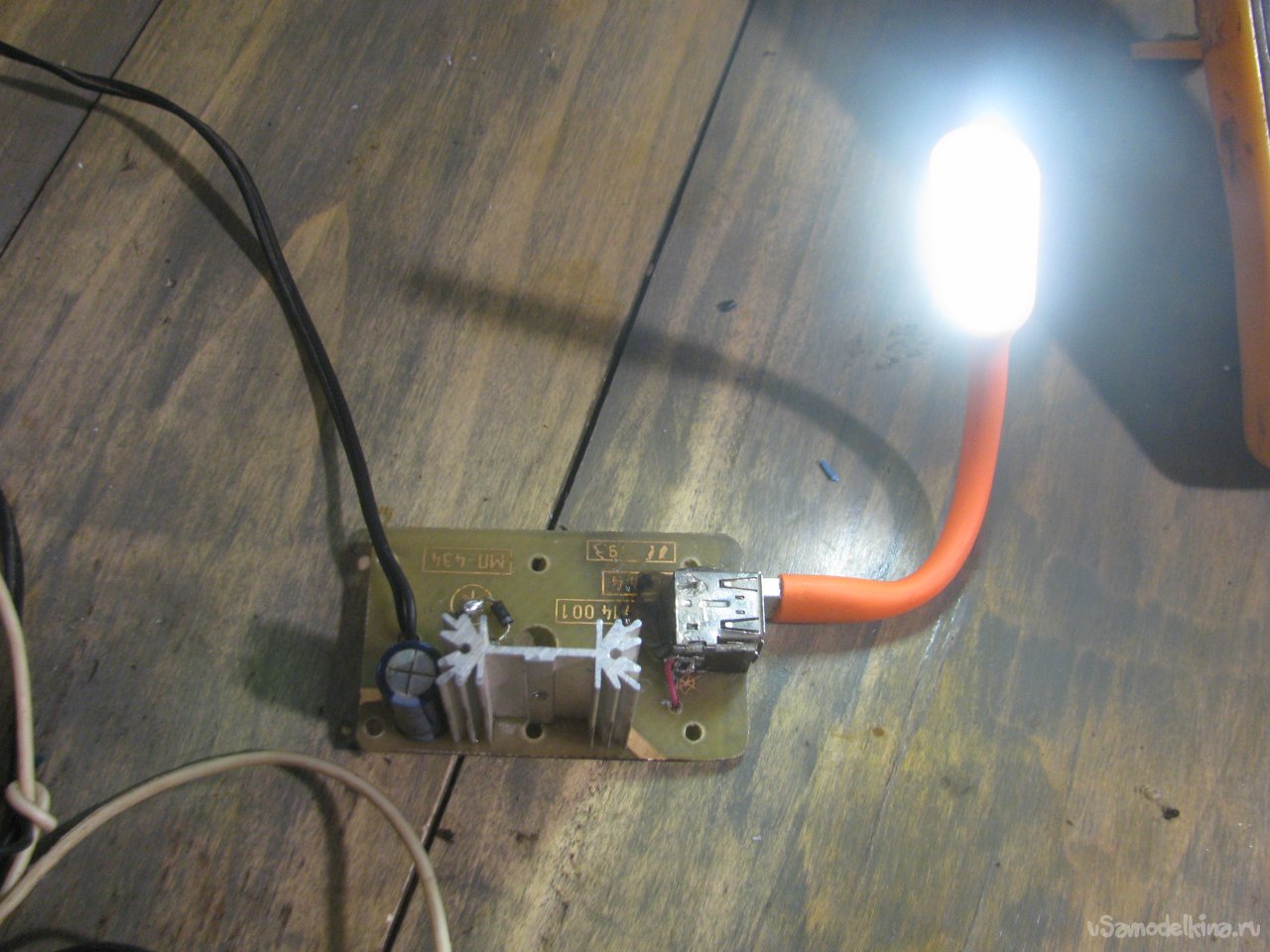 Припаиваем гнездо USB или просто кусок зарядного кабеля для телефона. Можно испытывать, я подключил свой блок питания с пульсирующим напряжением, на конденсаторе напряжение около 20В.