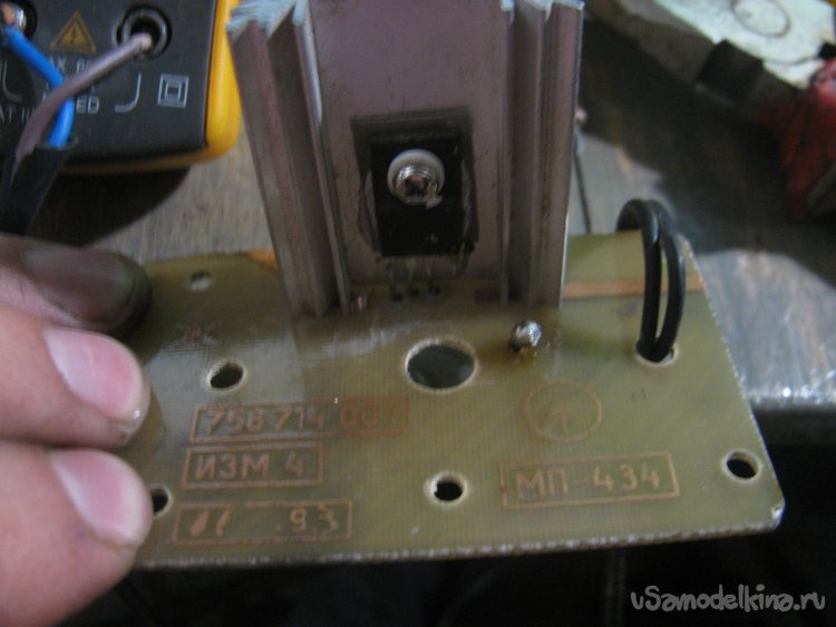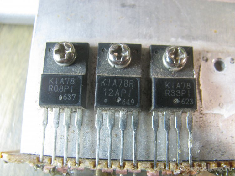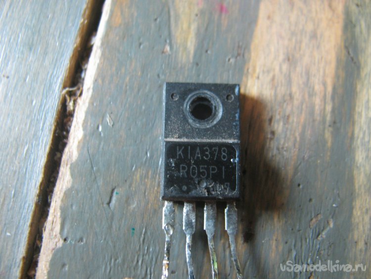 Нужную микросхему нашел на плате питания от какого-то музыкального центра. На одном радиаторе закреплено сразу несколько микросхем под разные напряжения, нам же нужна схема с цифрой 5, которая означает выходное напряжение в 5В.
