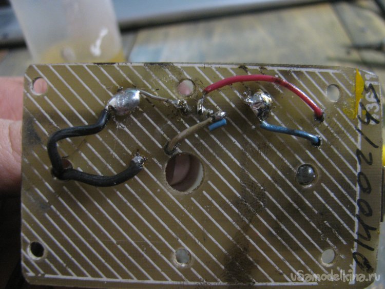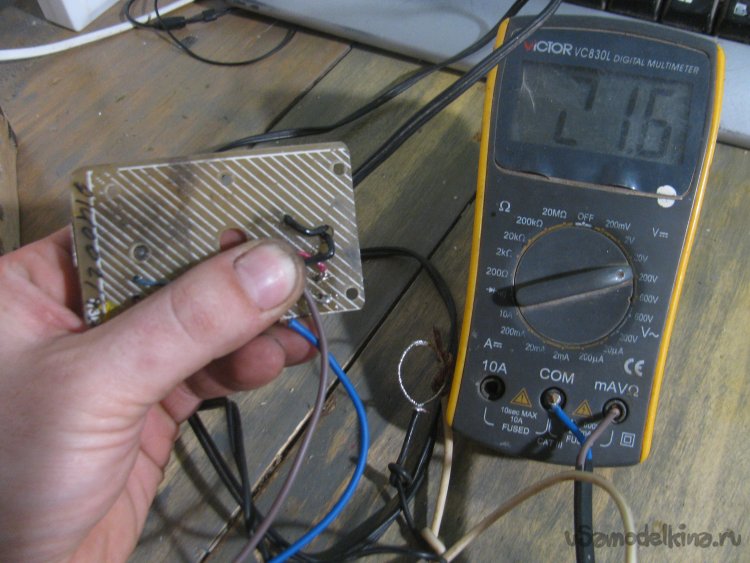 Собираем все так, чтобы провода не вырвали контакты. Я собирал на куске текстолита, конструкция у меня получилась немного другая, так как я это делал под генератор. Тут можно увидеть диод, которые не дает току идти обратно в АКБ при падении оборотов, а также есть конденсаторы, которые выравнивают пульсации генератора.